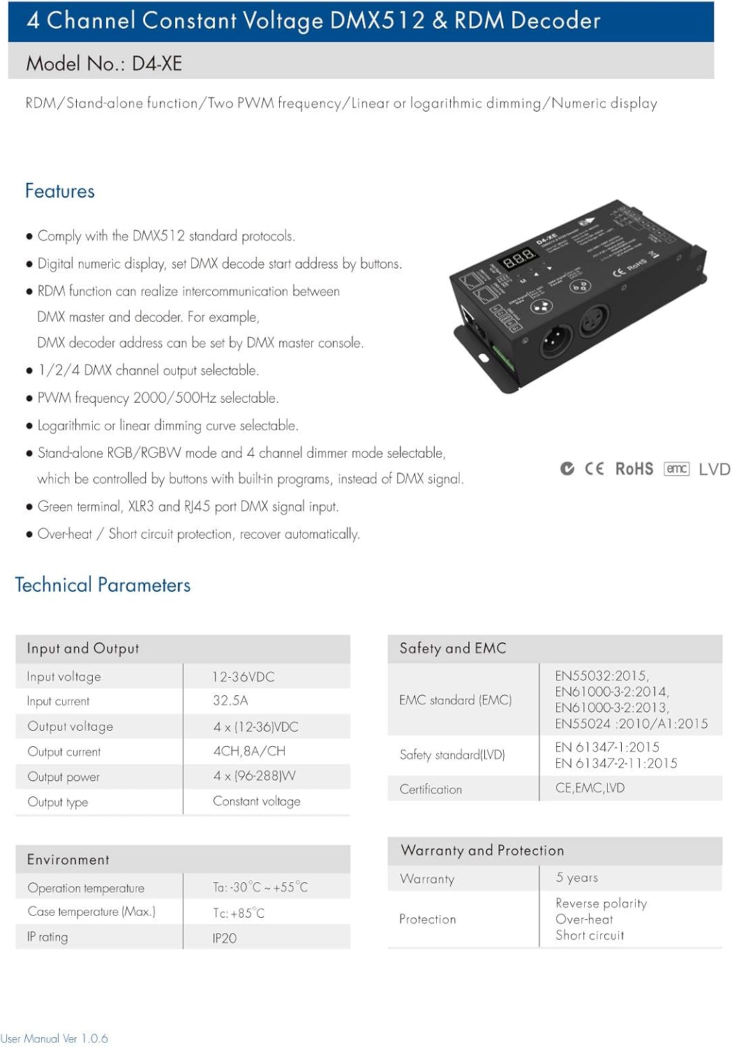 - DMX Uitgang: 3-pin XLR, RJ45 en rechtstreekse draadaansluiting
